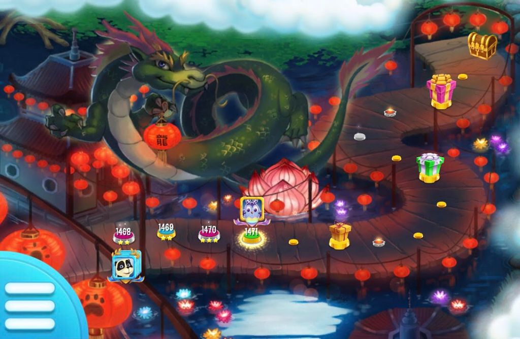 After three long hours, Angie was now walking on a wooden walkway surrounded by water. A Chinese dragon floated around a temple and rested near a lotus lantern.